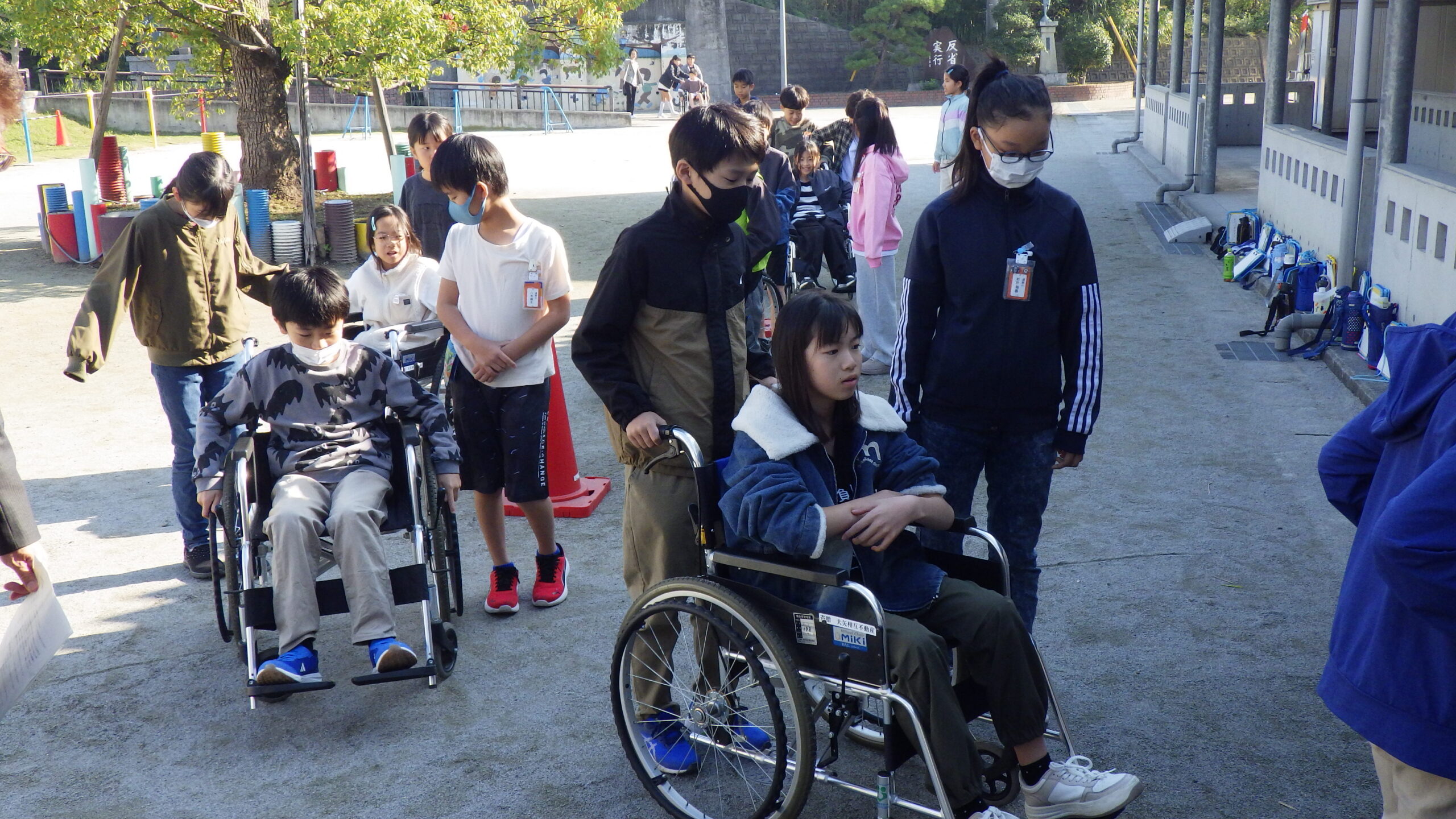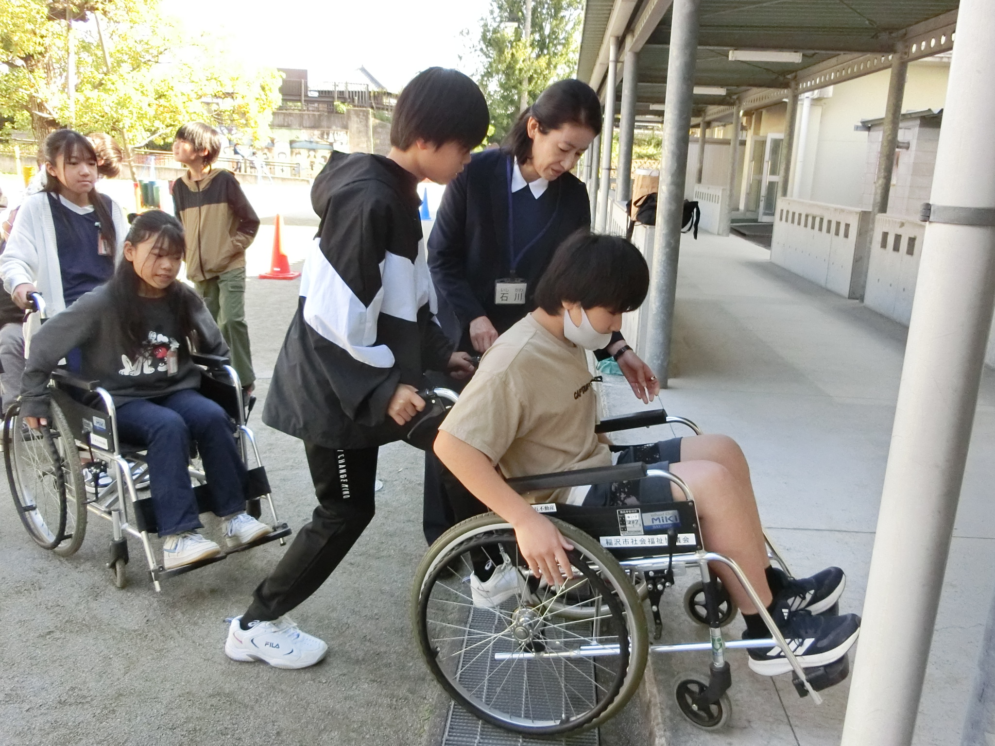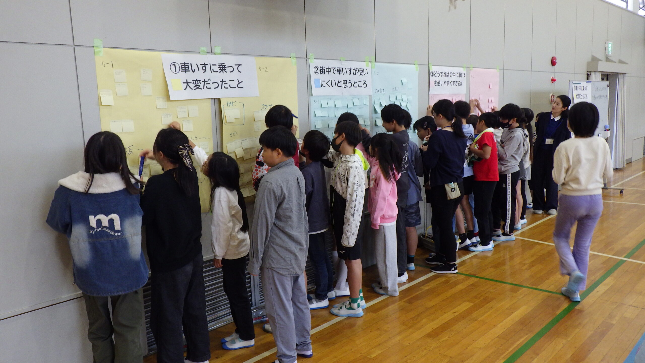 子どもたちは、実際に車いすに乗って自分の力で操作したり、坂や段差を登ったりすることで、車いすで生活している方の大変さを感じました。また、車いすの補助をすることの難しさも感じました。体験後は、車いすに乗ってみて大変だったこと・街中で車いすが使いにくいところ・どうすれば街中で車いすを使いやすくなるのかについて、みんなで考えました。