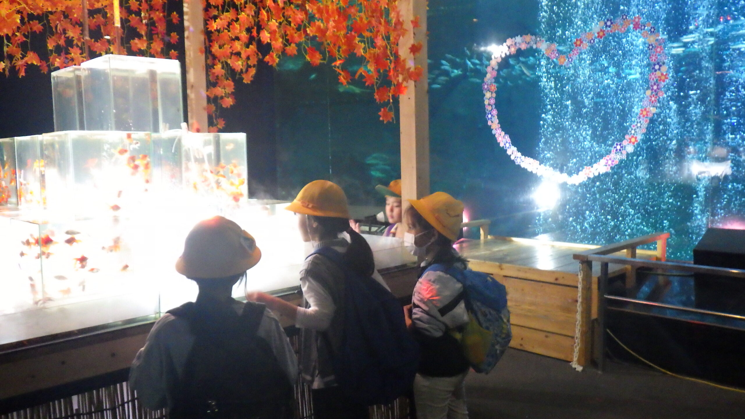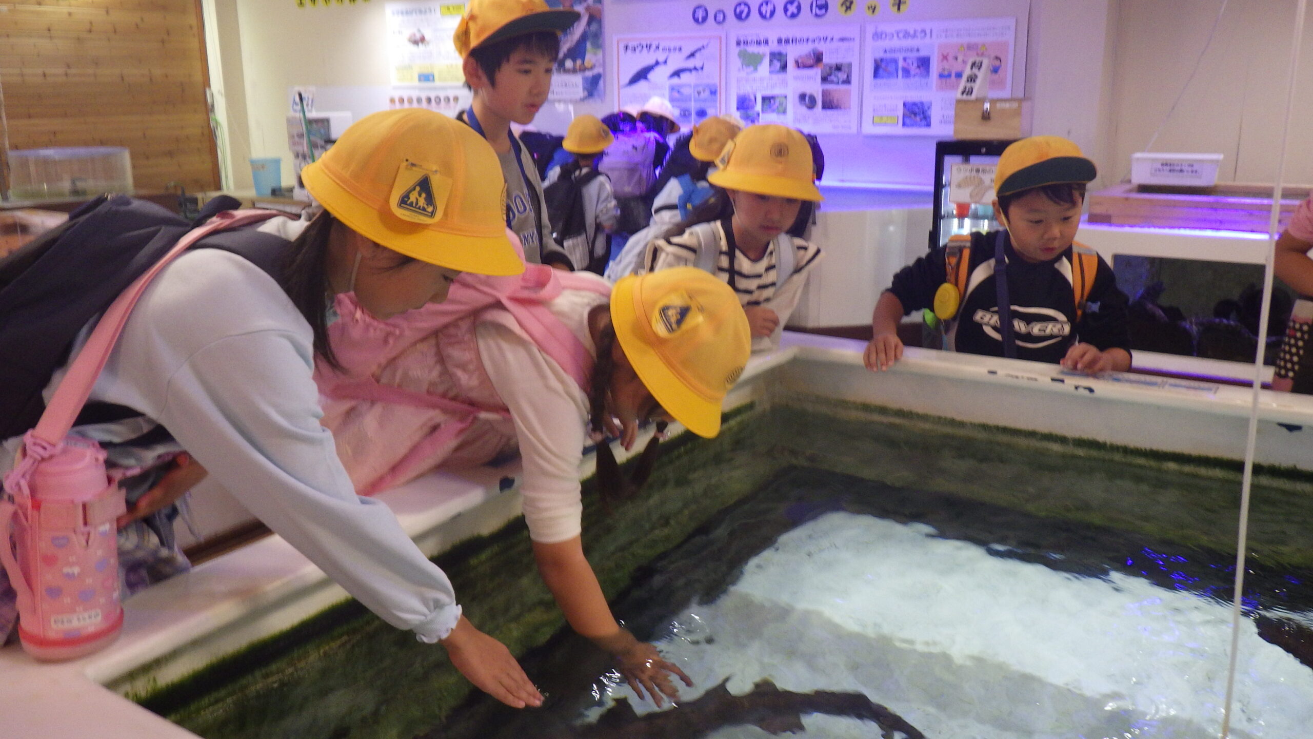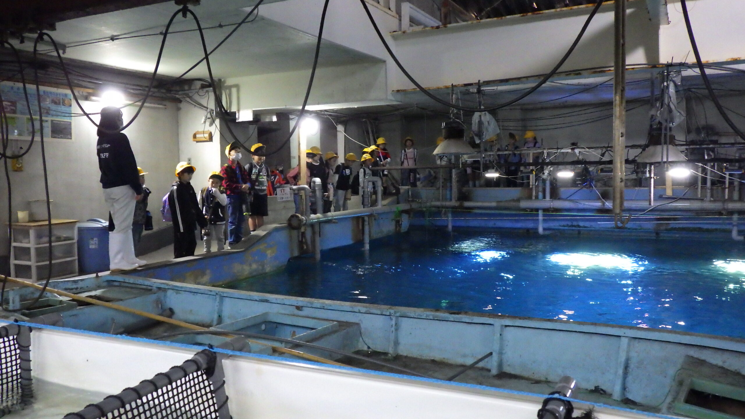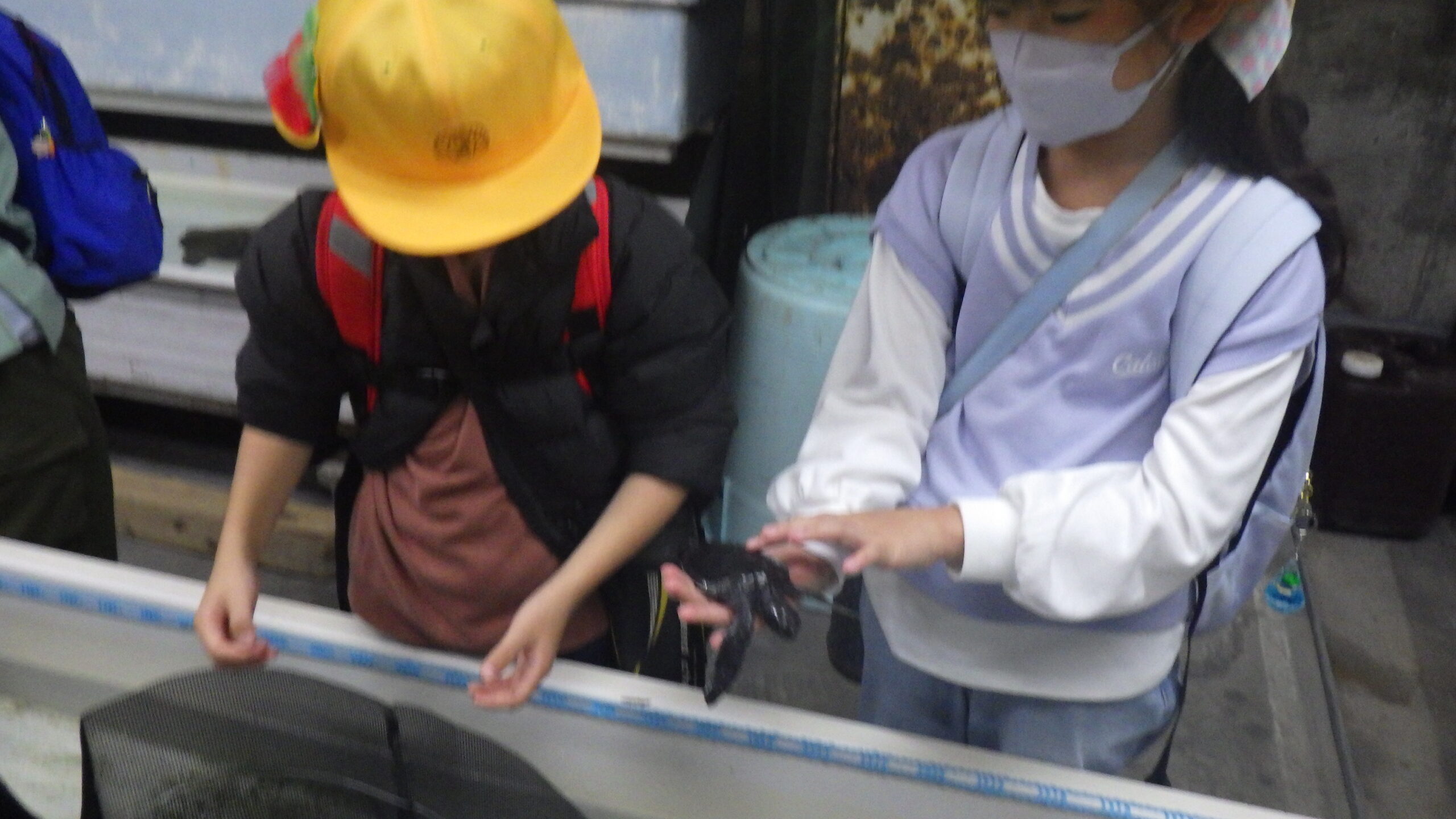 次にバックヤードツアーを行いました。水槽を上から見たり、魚のえさの説明を受けたりと、普段知りえない情報や体験をさせていただきました。ふれあいおさかな館では、チョウザメやエイなどに、実際に触れられることがうれしかったようで、怖がりながらも触る子供たちの姿が見られました。