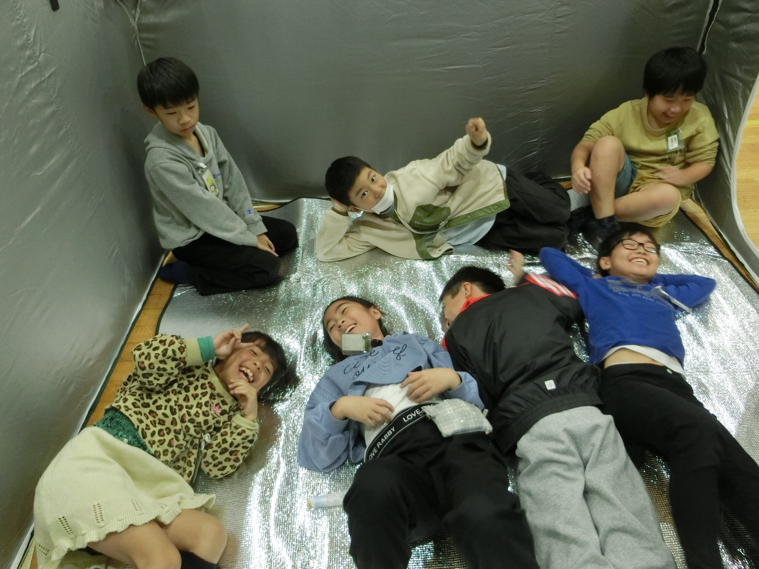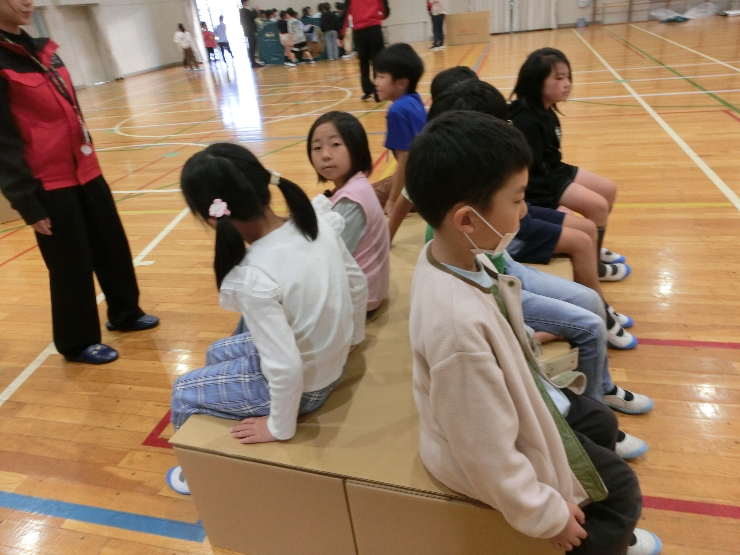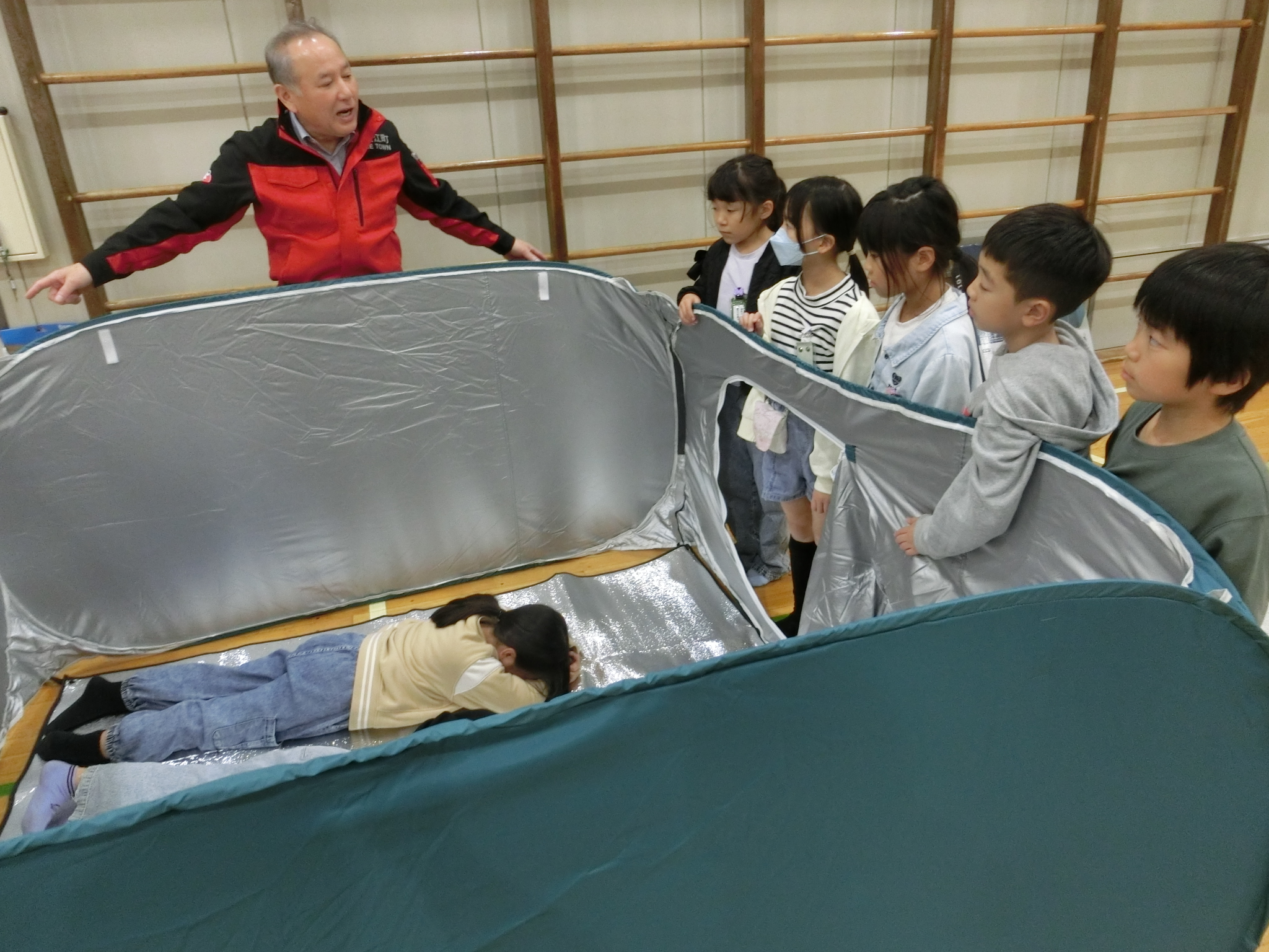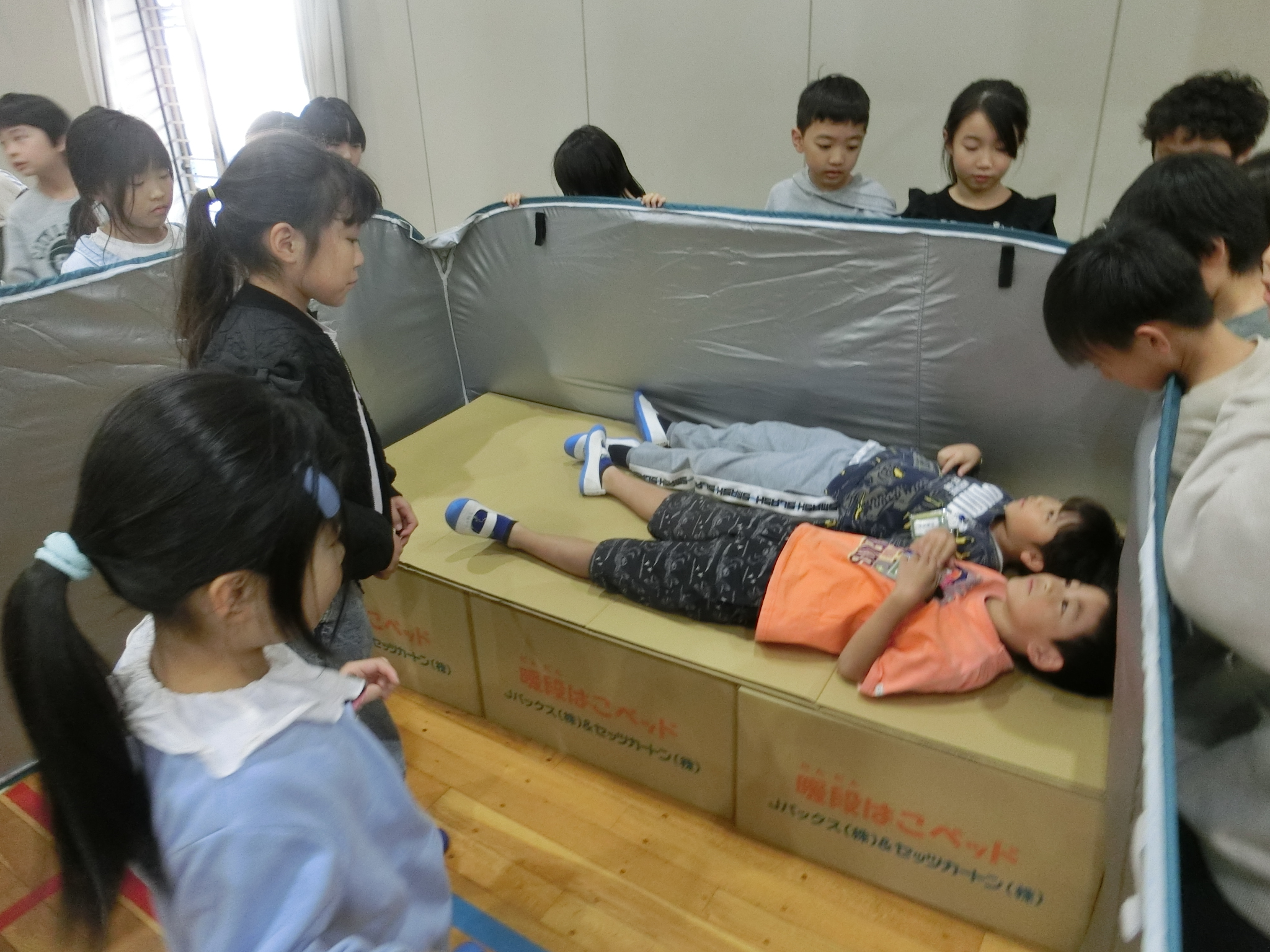 3年生は、蟹江町役場の安心安全課の方をお招きし、須西小学校が避難所になったときのために備蓄してある、簡易トイレの使い方や、段ボールベッドの組み立て方などの体験をさせていただきました。