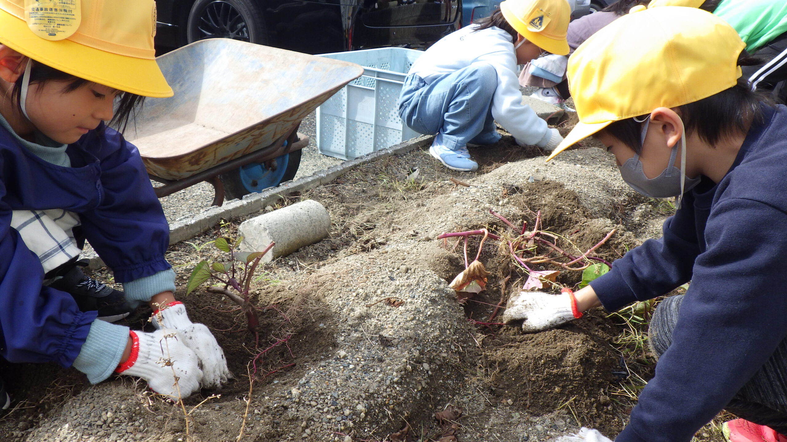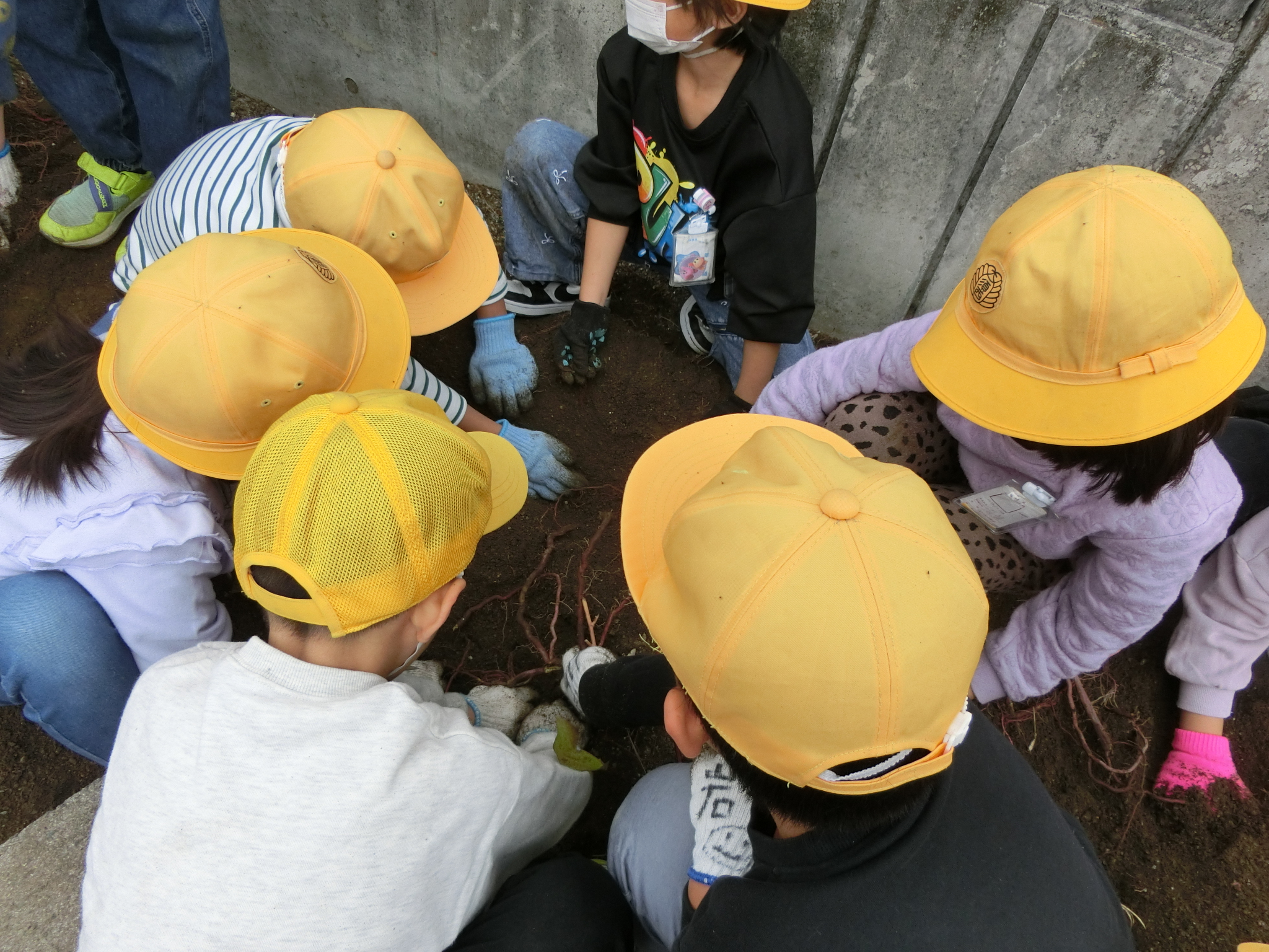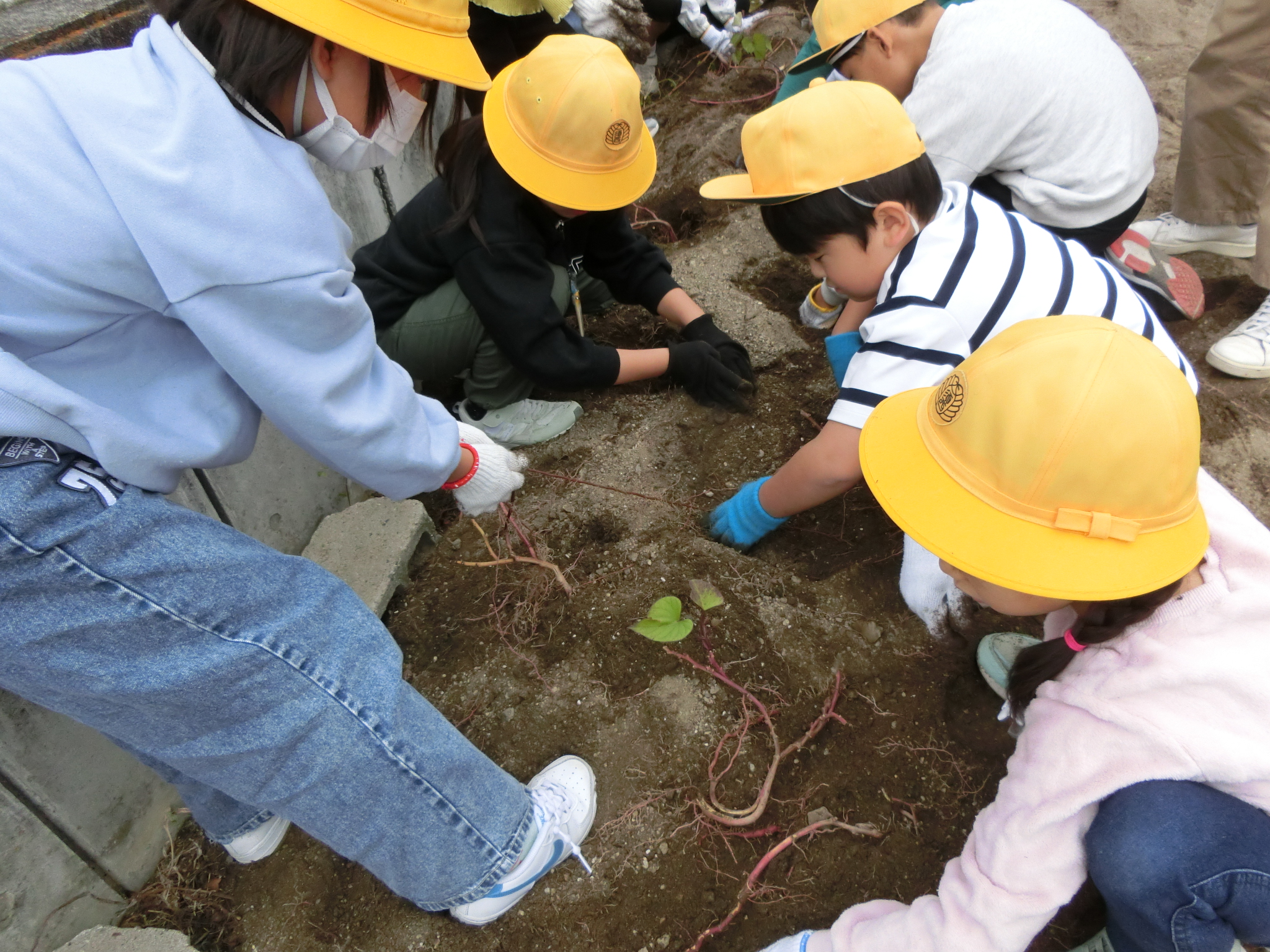 11月12日(水)の2時間目に1年生、3時間目に2年生がサツマイモの収穫を行いました。子どもたちは、土の奥深くにあるサツマイモを熱心に堀っていました。