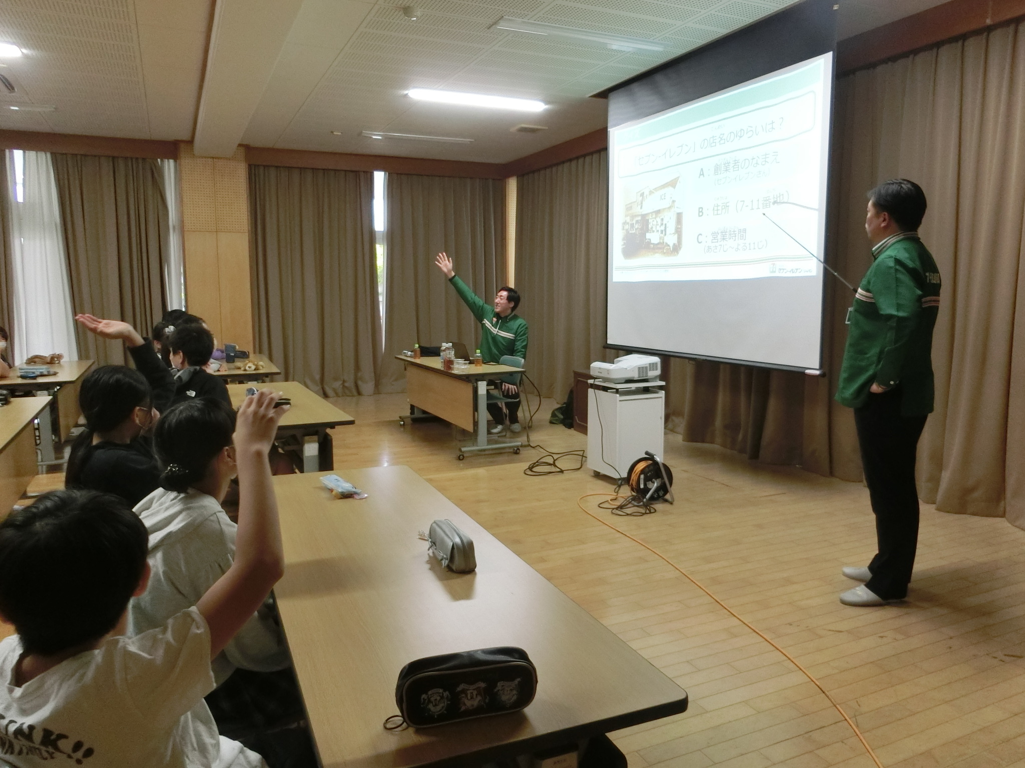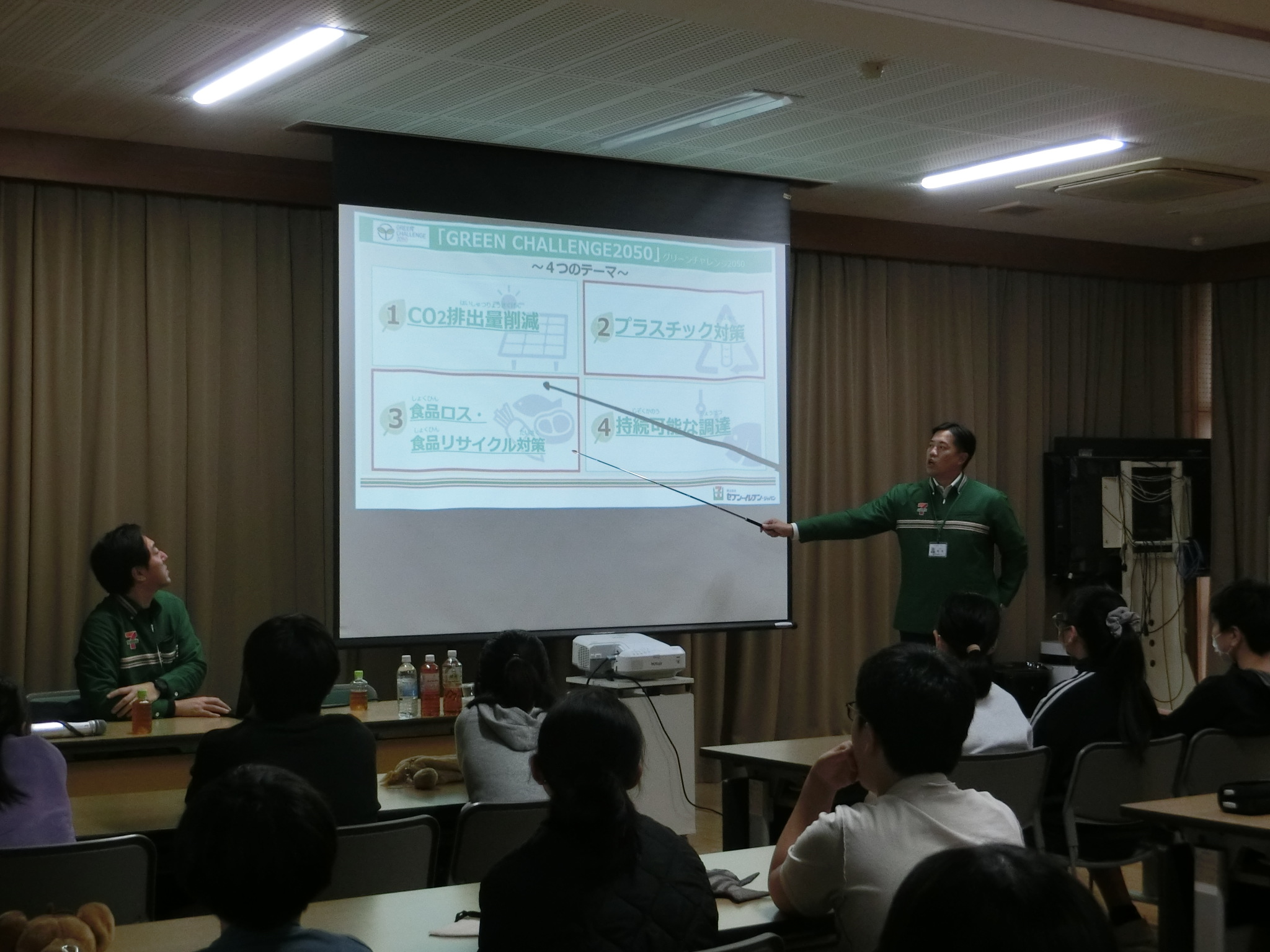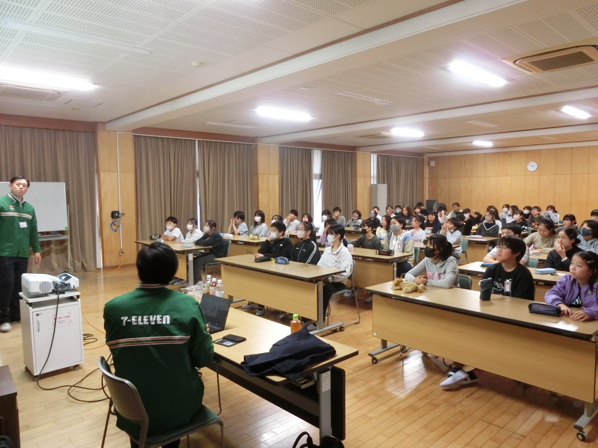 11月13日(木)5時間目にセブンイレブンの方に出前授業をしていただきました。セブンイレブンがSDGsについて取り組んでいることを教えていただきました。今後世界の人口が増えていくことが考えられる中で、人間が使うプラスチックの量を削減することができないかと考え、さまざまな取り組みをされていました。ペットボトルの再利用のための機械を店頭に置いたり、コンビニで使われている容器のふたをプラスチックからシールに変えたりしているそうです。