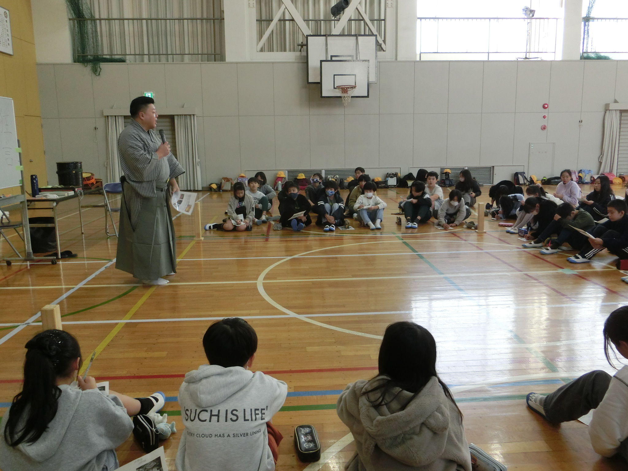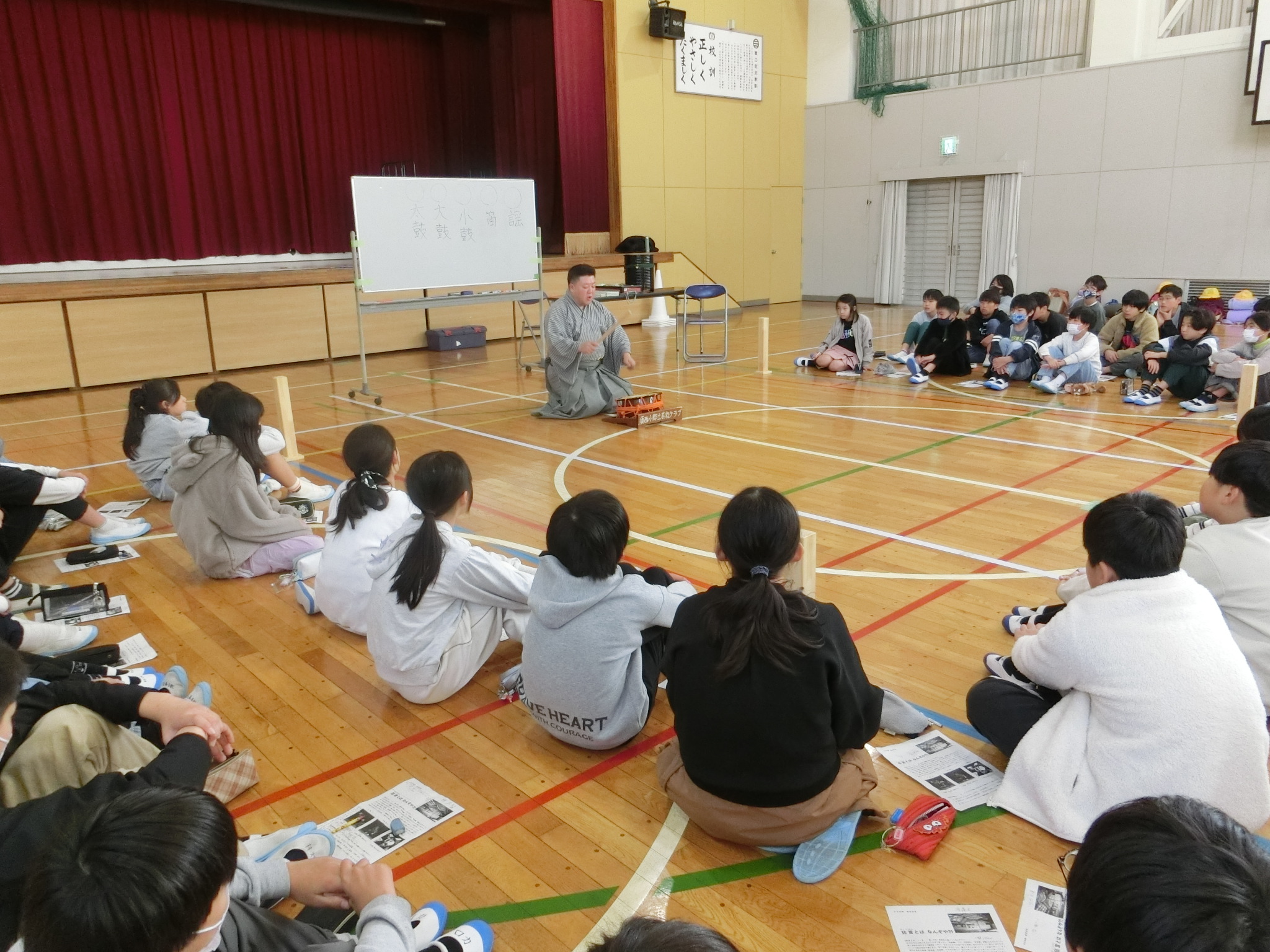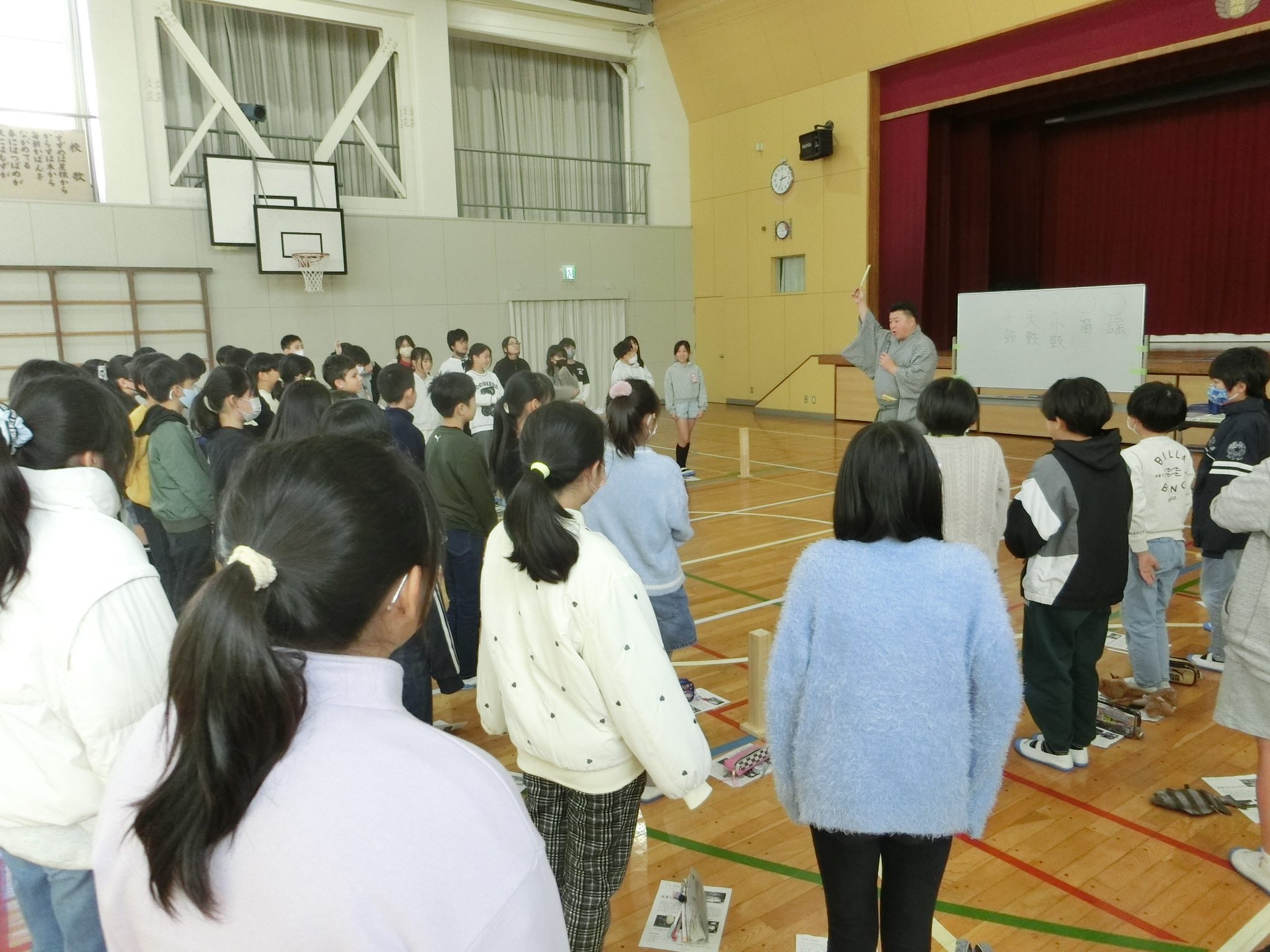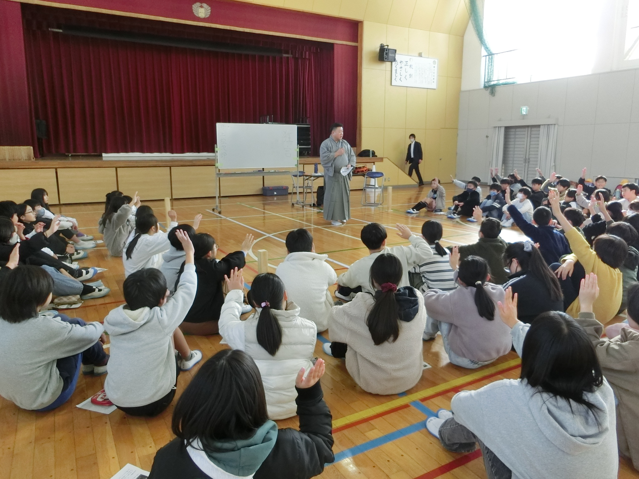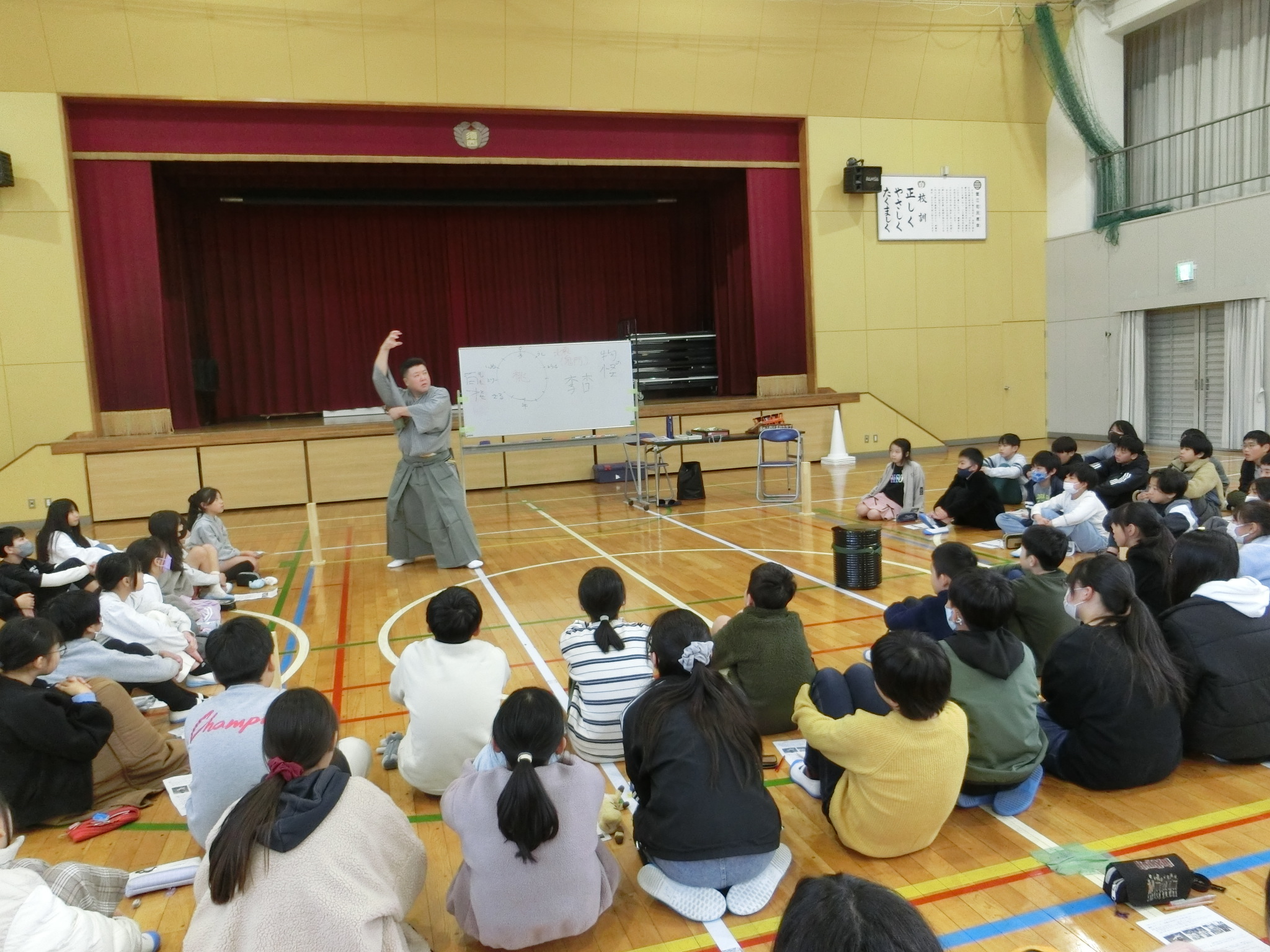 狂言の歴史や「狂言」と「能」、「歌舞伎」の違いについて丁寧に教えていただきました。授業の途中には、狂言での発声の体験をしました。ゆっくり、はっきり、抑揚をつけることを意識して練習しました。子どもたちも最初は言い方に慣れない様子でしたが、何度も練習したことで少しずつできるようになっていました。最後には、狂言の「柿山伏」の一部を実際に見せていただき、声の響きや迫力、動きの細かさなどに驚きました。実際に目で見て体験したことで、教科書ではわからないことを学べた貴重な経験になったと思います。井上先生ありがとうございました。
