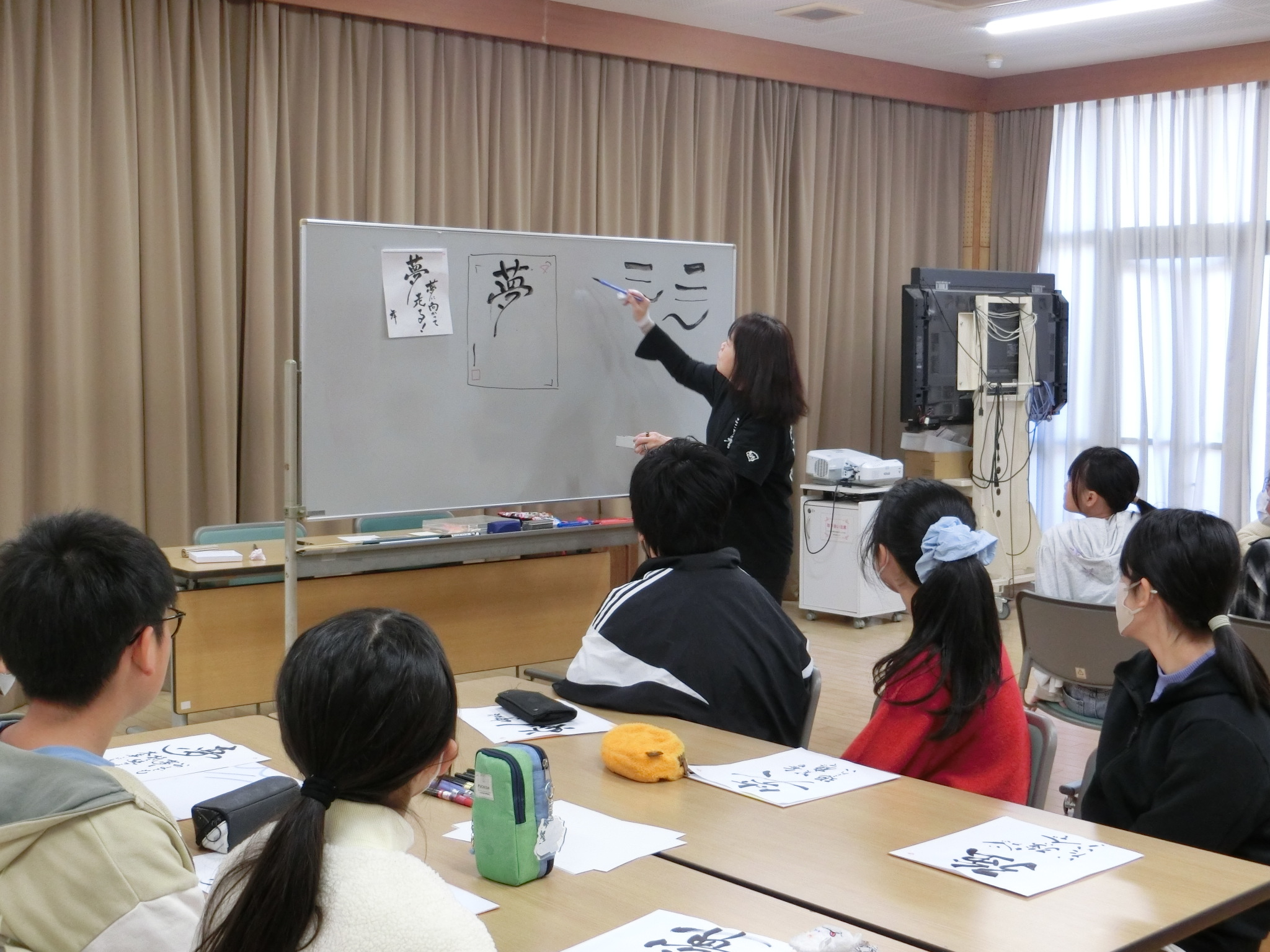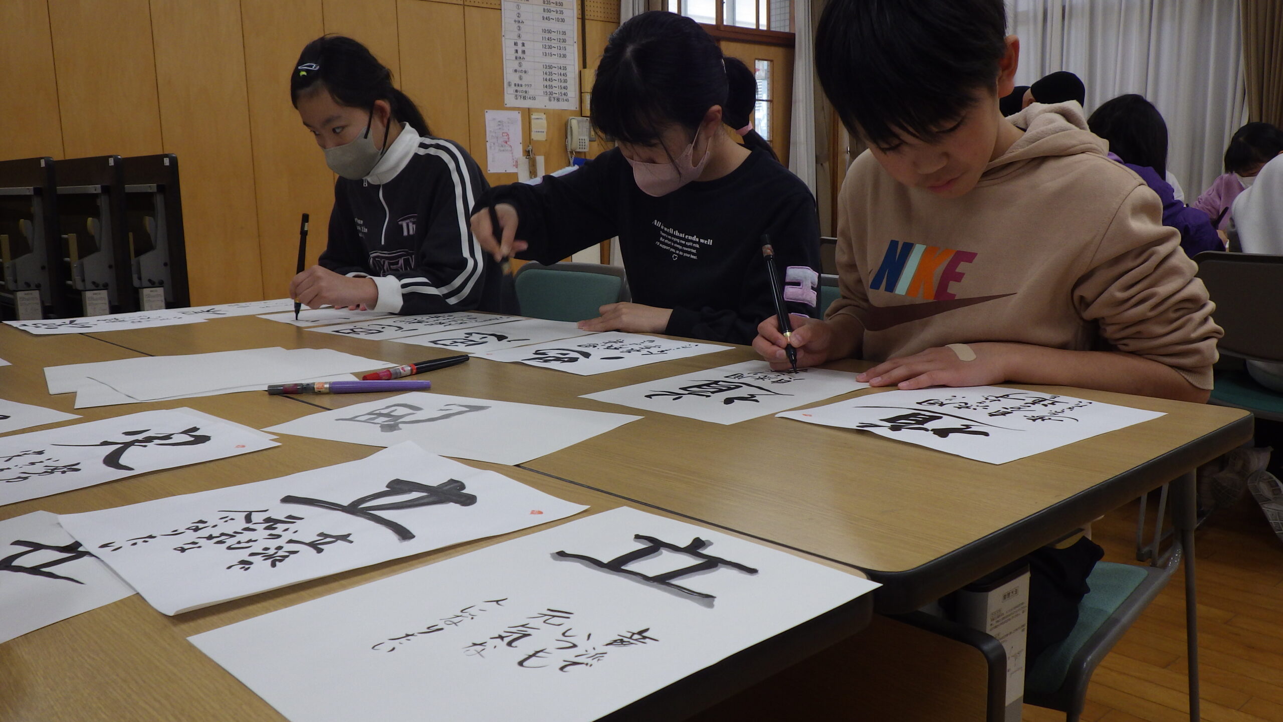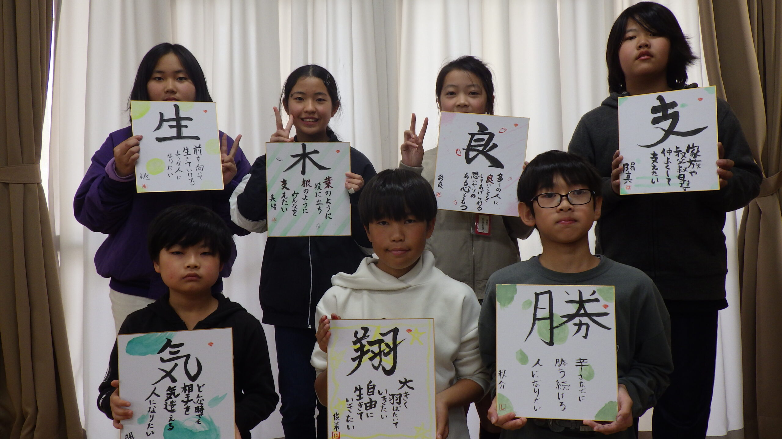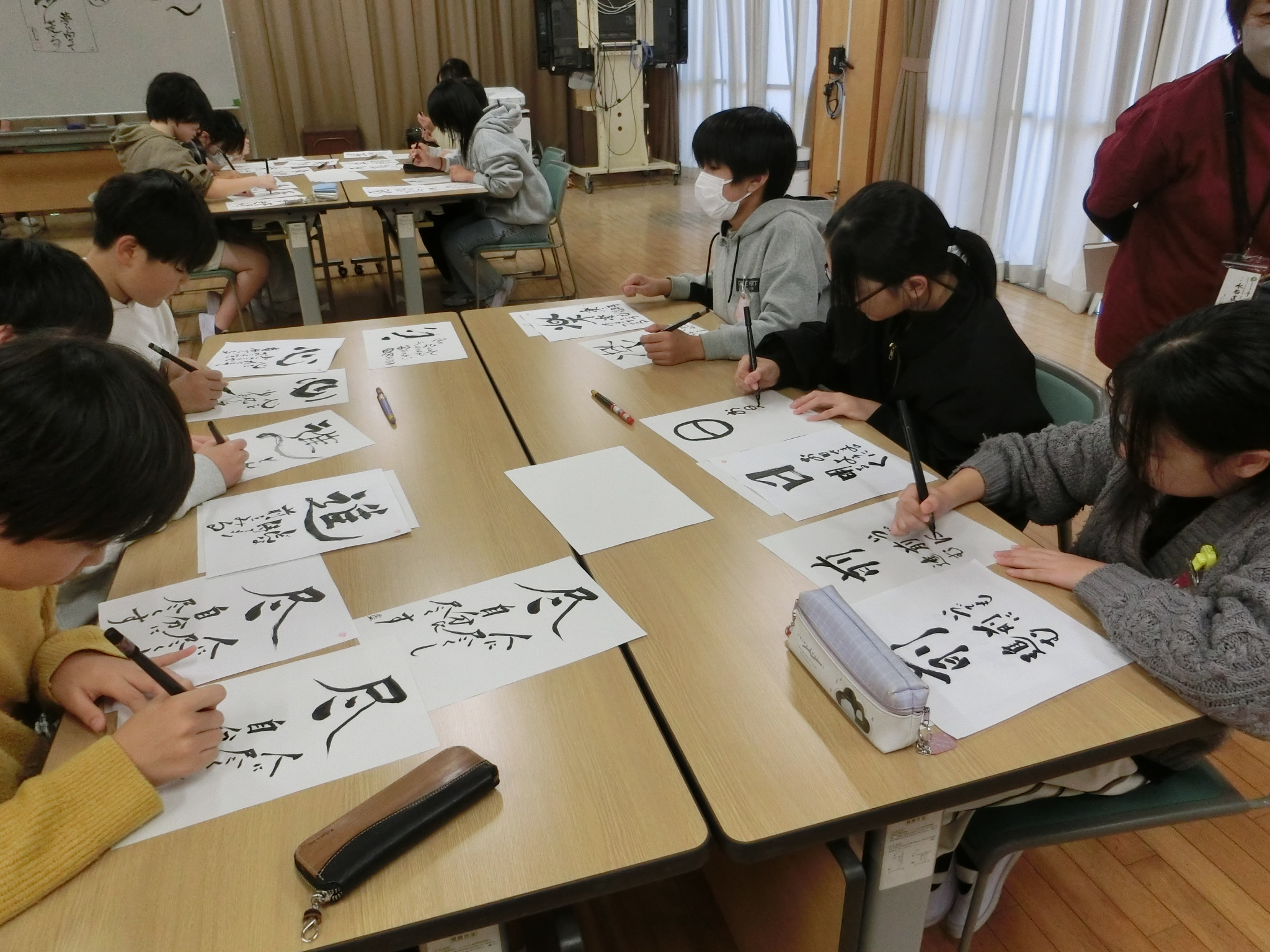 11月28日(金)に、志乃書画協会の西尾先生をはじめ、5名の先生方に御来校いただき、「こころの書」の出前授業をしていただきました。3時間目に2組、4時間目に1組で、自分の決めた一字と込めた思いを表現しました。事前に絵の具で色紙に背景を描き、その上に文字を重ねました。字は、先生方に作成していただいた見本をもとに、自分なりに工夫し、教えていただきながら練習して本番の色紙に挑みました。子どもたちは、楽しそうにそれぞれの思いを表現し、三者三様の特別な「こころの書」が完成しました。大切にしたい気持ちや姿など、一人一人の気持ちがこもっていました。
