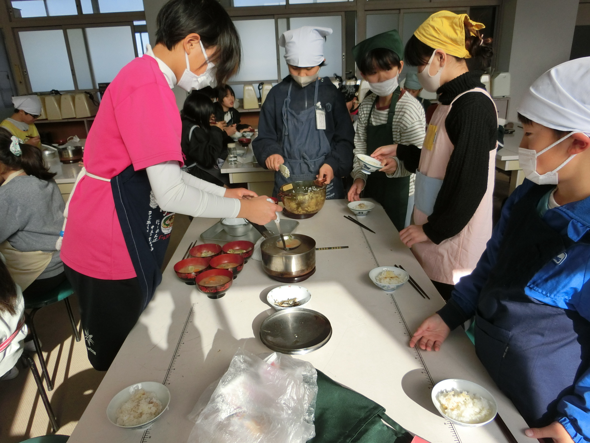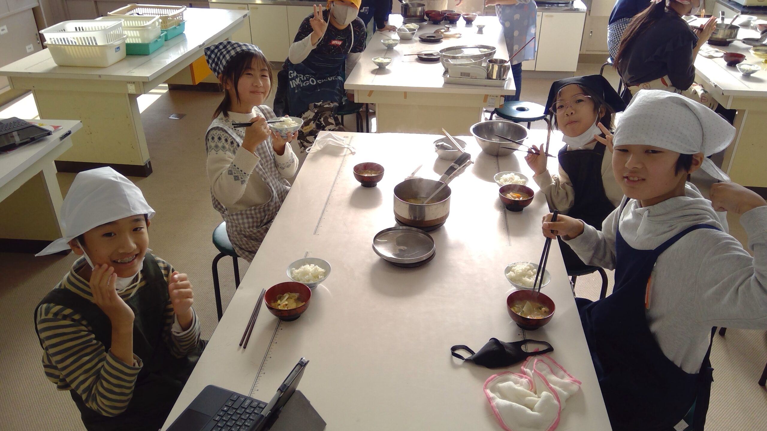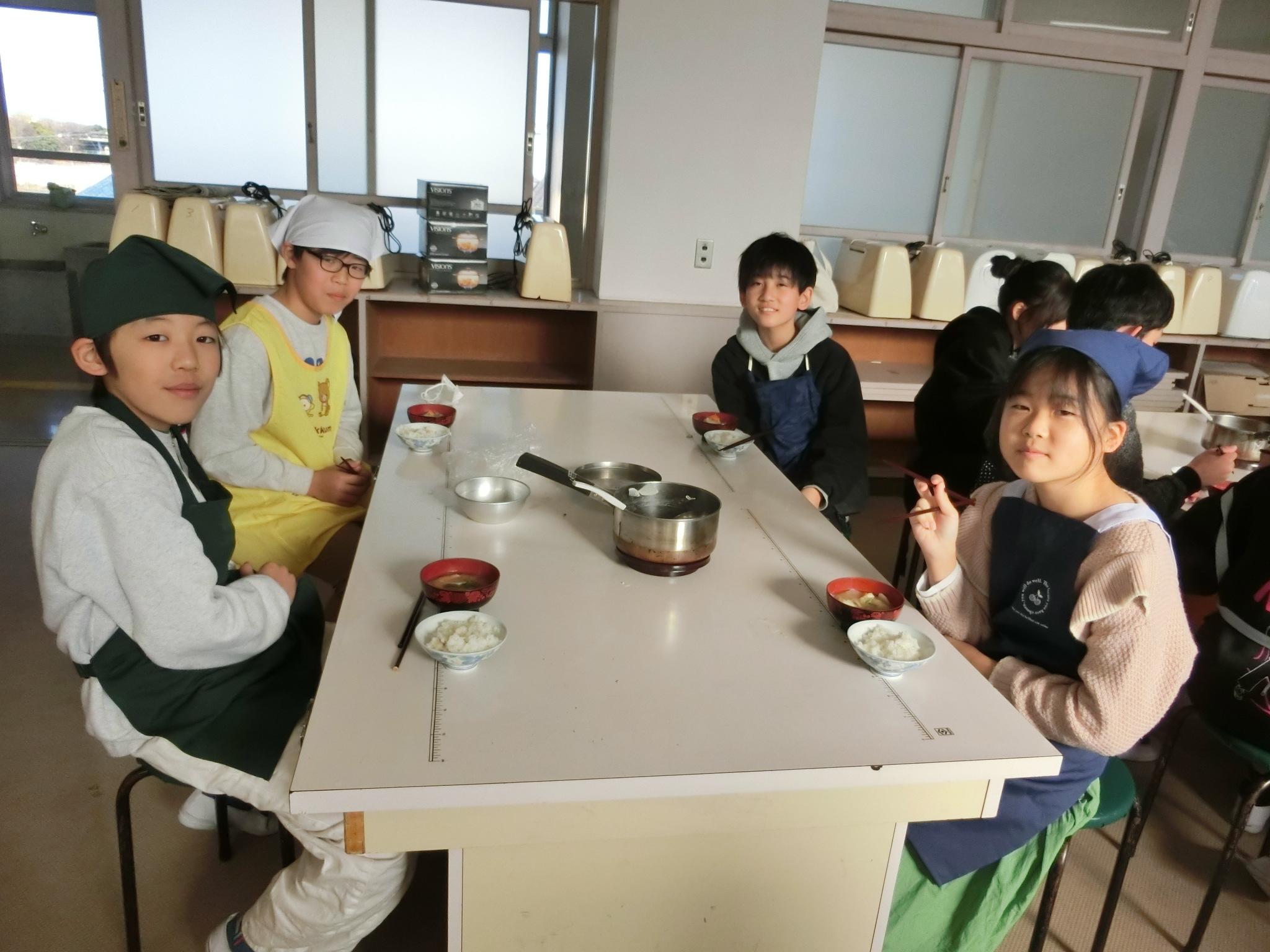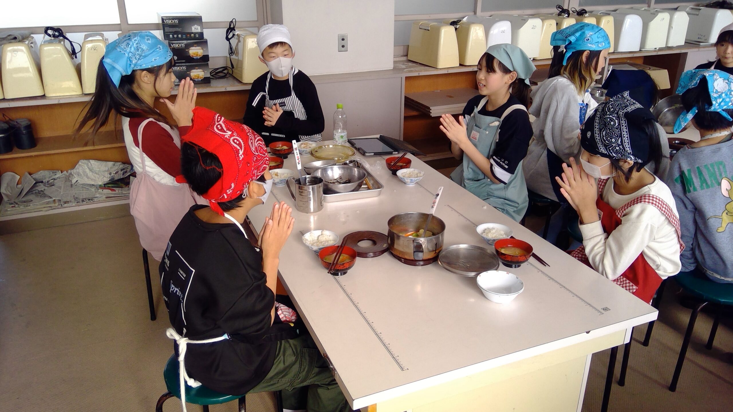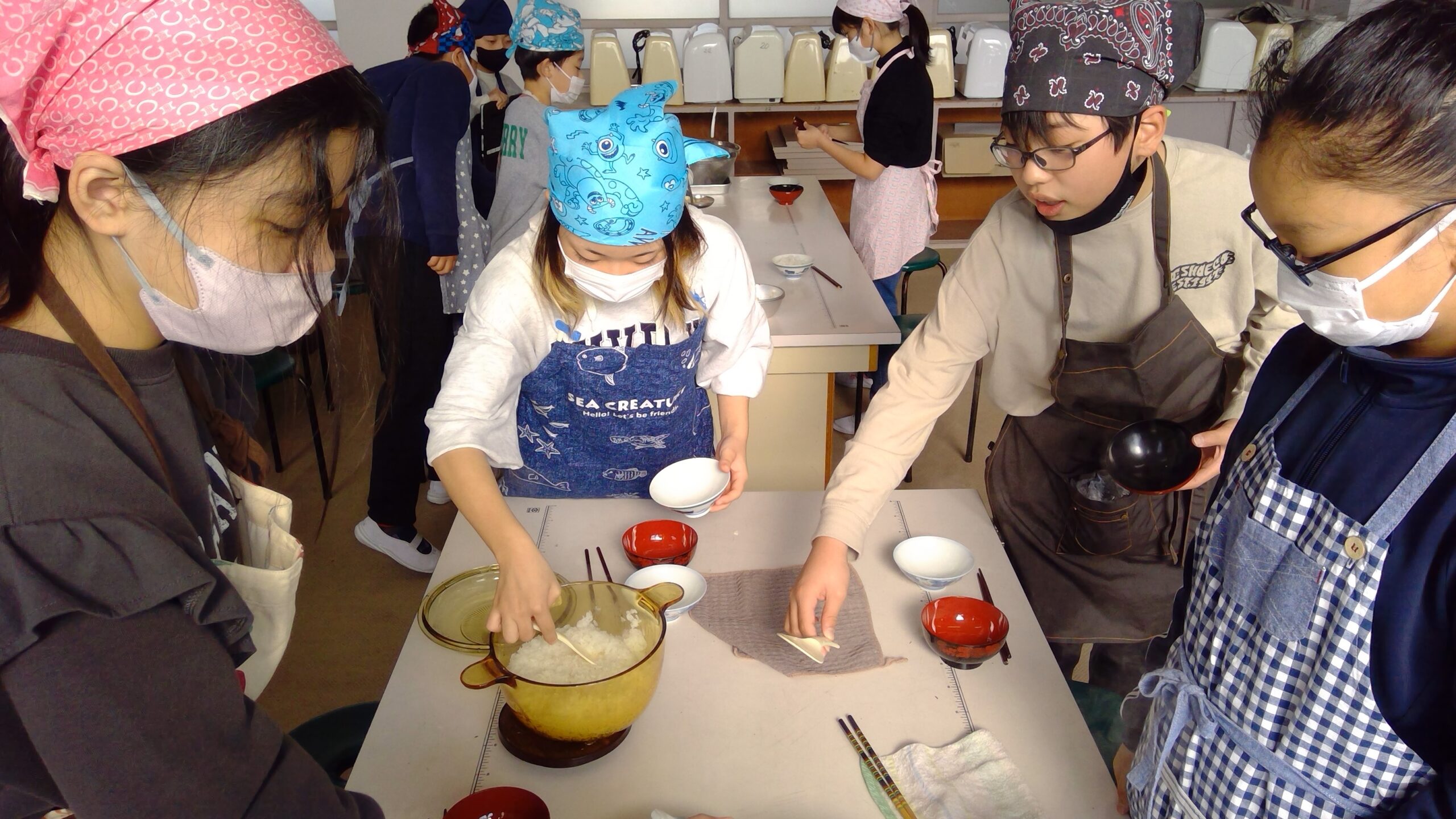 5年生は、家庭科の学習で「ごはんとみそ汁」作りに取り組みました。水の量や火加減に気を付けながらご飯を炊きました。みそ汁では、にぼしのだしの取り方や具材の切り方を学び、具材を入れるタイミングを考えながら調理しました。友達と声を掛け合い、協力して準備や片付け・調理を行う姿が見られました。自分たちで作る喜びや楽しさを感じることができました。