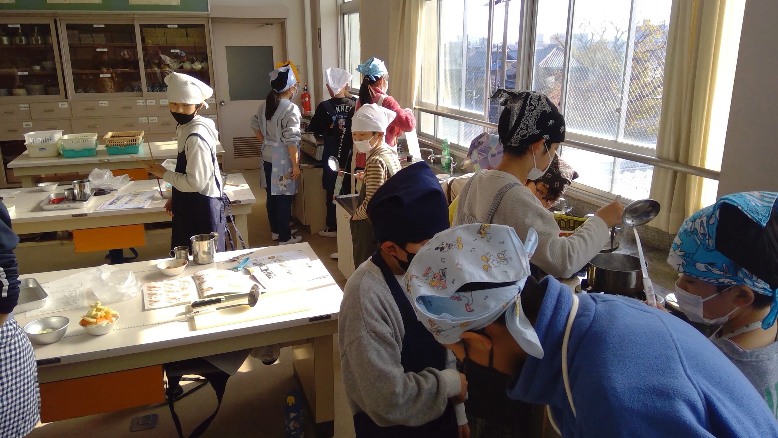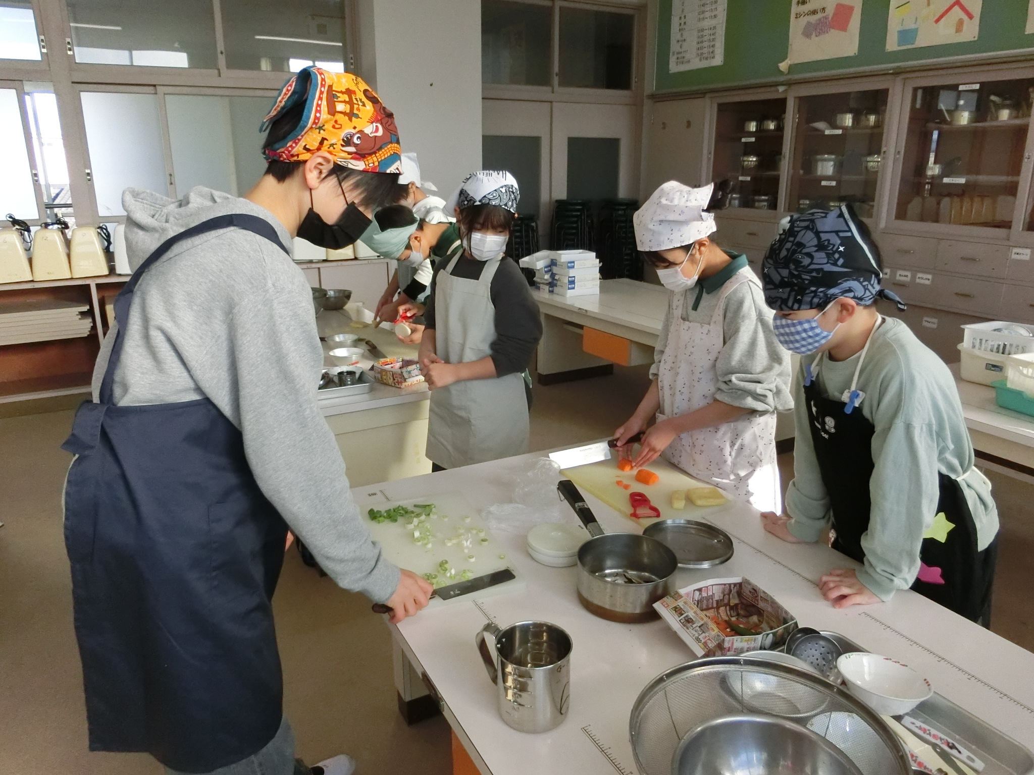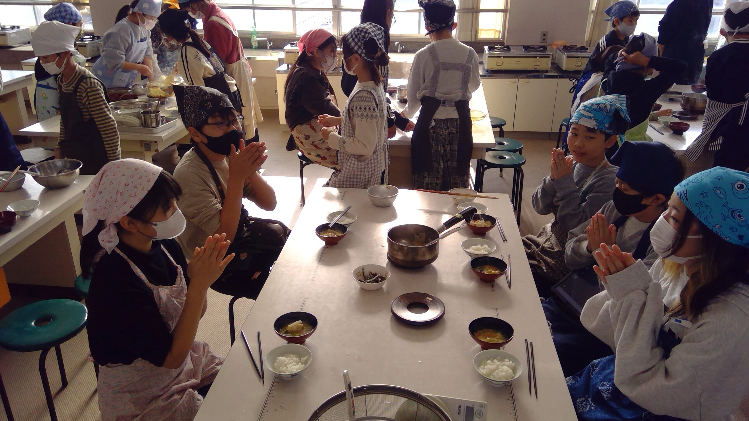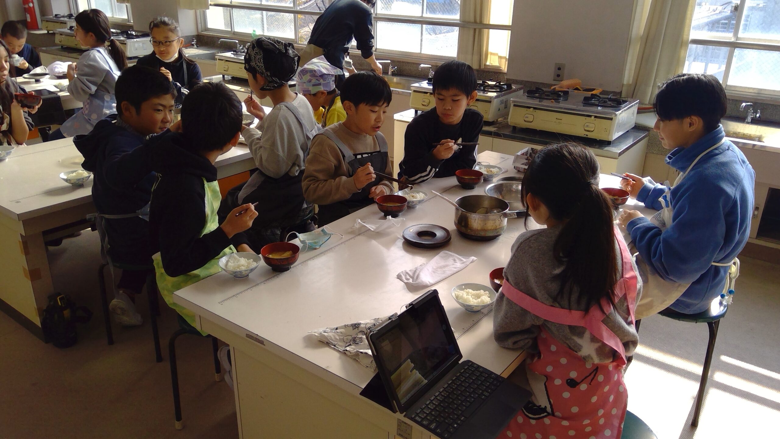 5年生は、家庭科の学習で「ごはんとみそ汁」作りに取り組みました。水の量や火加減に気を付けながらご飯を炊きました。みそ汁では、にぼしのだしの取り方や具材の切り方を学び、具材を入れるタイミングを考えながら調理しました。友達と声を掛け合い、協力して準備や片付け・調理を行う姿が見られました。自分たちで作る喜びや楽しさを感じることができました。