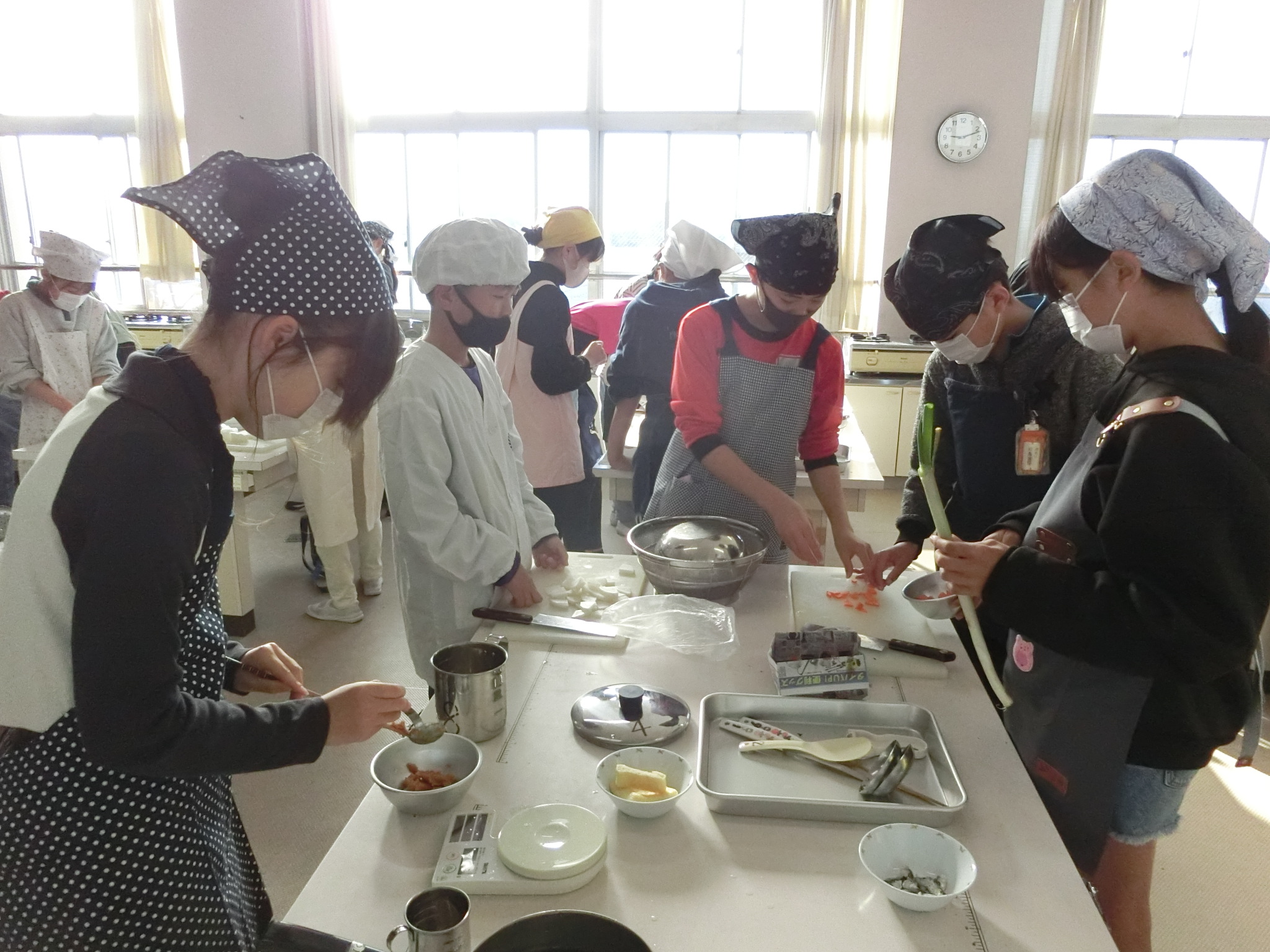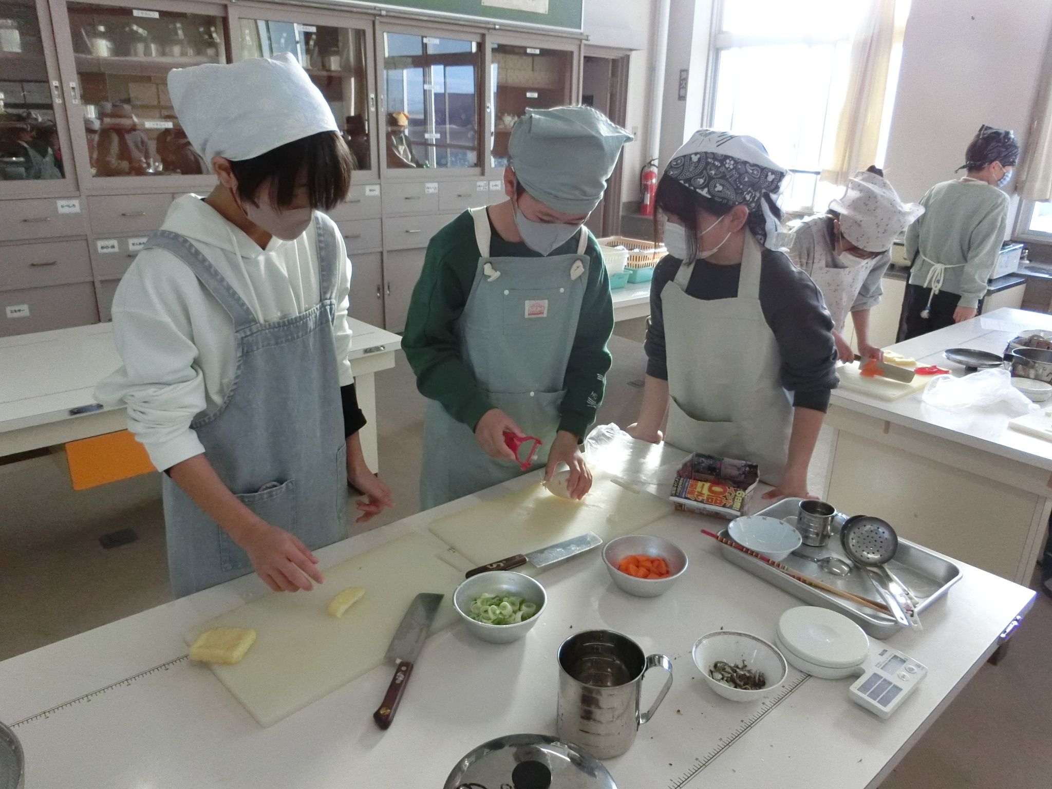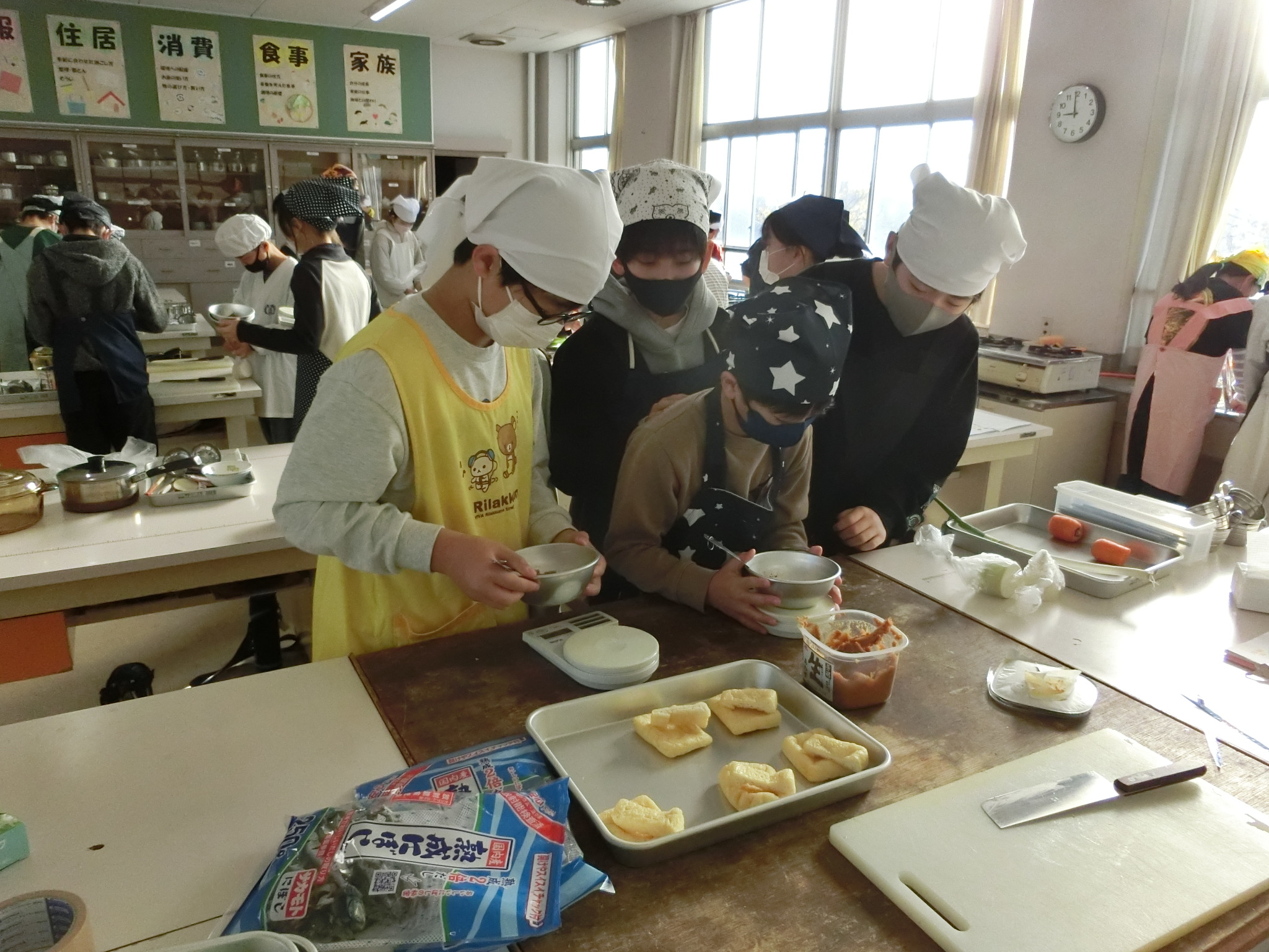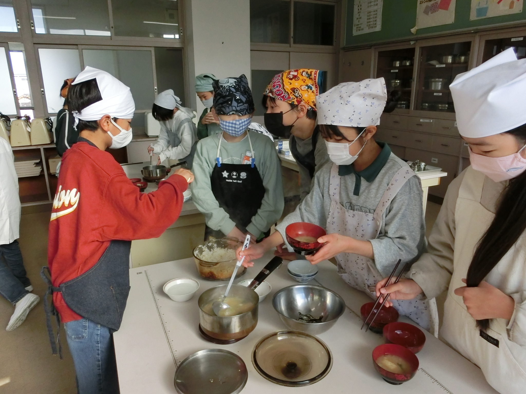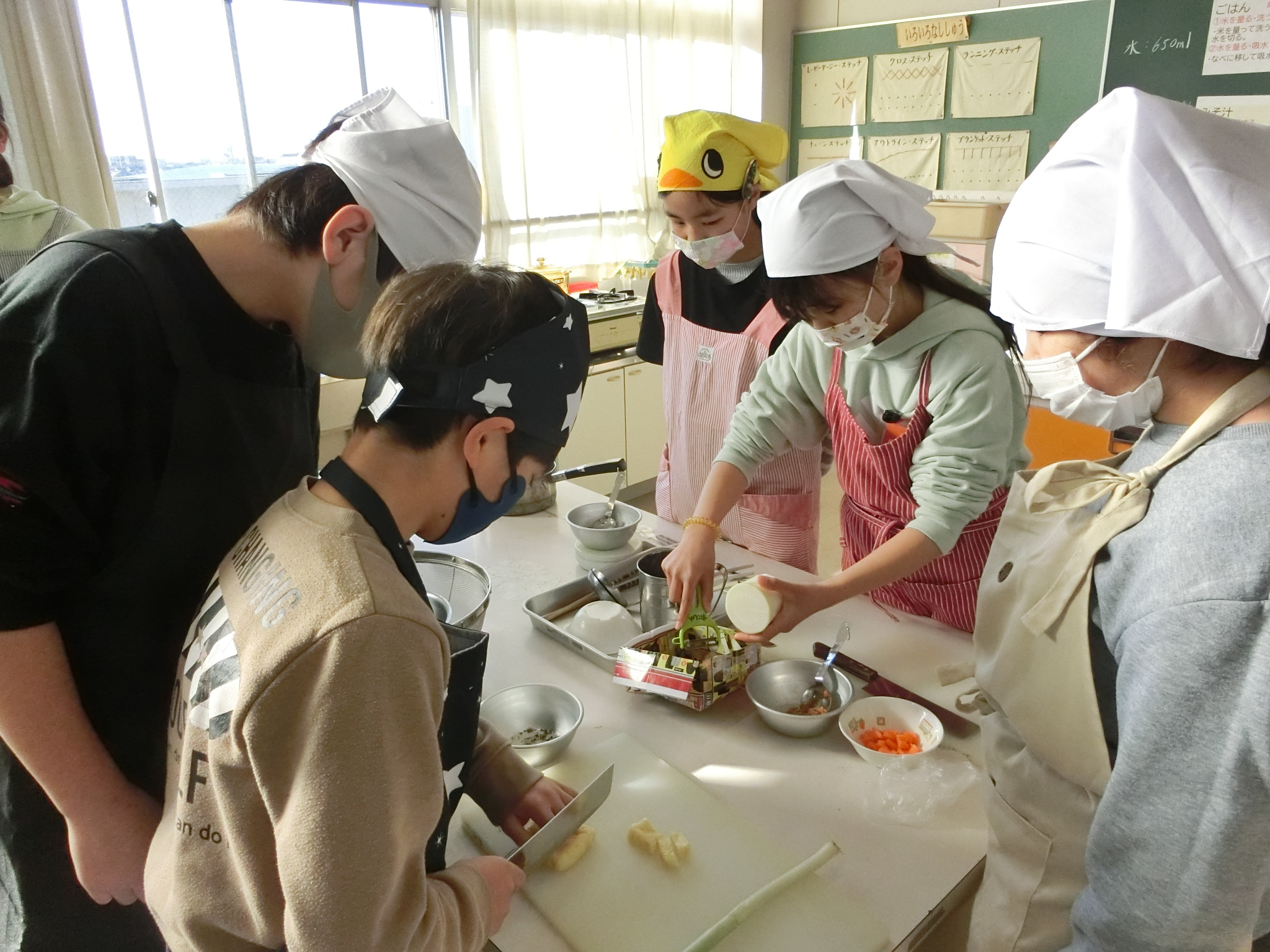5年生は、家庭科の学習で「ごはんとみそ汁」作りに取り組みました。水の量や火加減に気を付けながらご飯を炊きました。みそ汁では、にぼしのだしの取り方や具材の切り方を学び、具材を入れるタイミングを考えながら調理しました。友達と声を掛け合い、協力して準備や片付け・調理を行う姿が見られました。自分たちで作る喜びや楽しさを感じることができました。