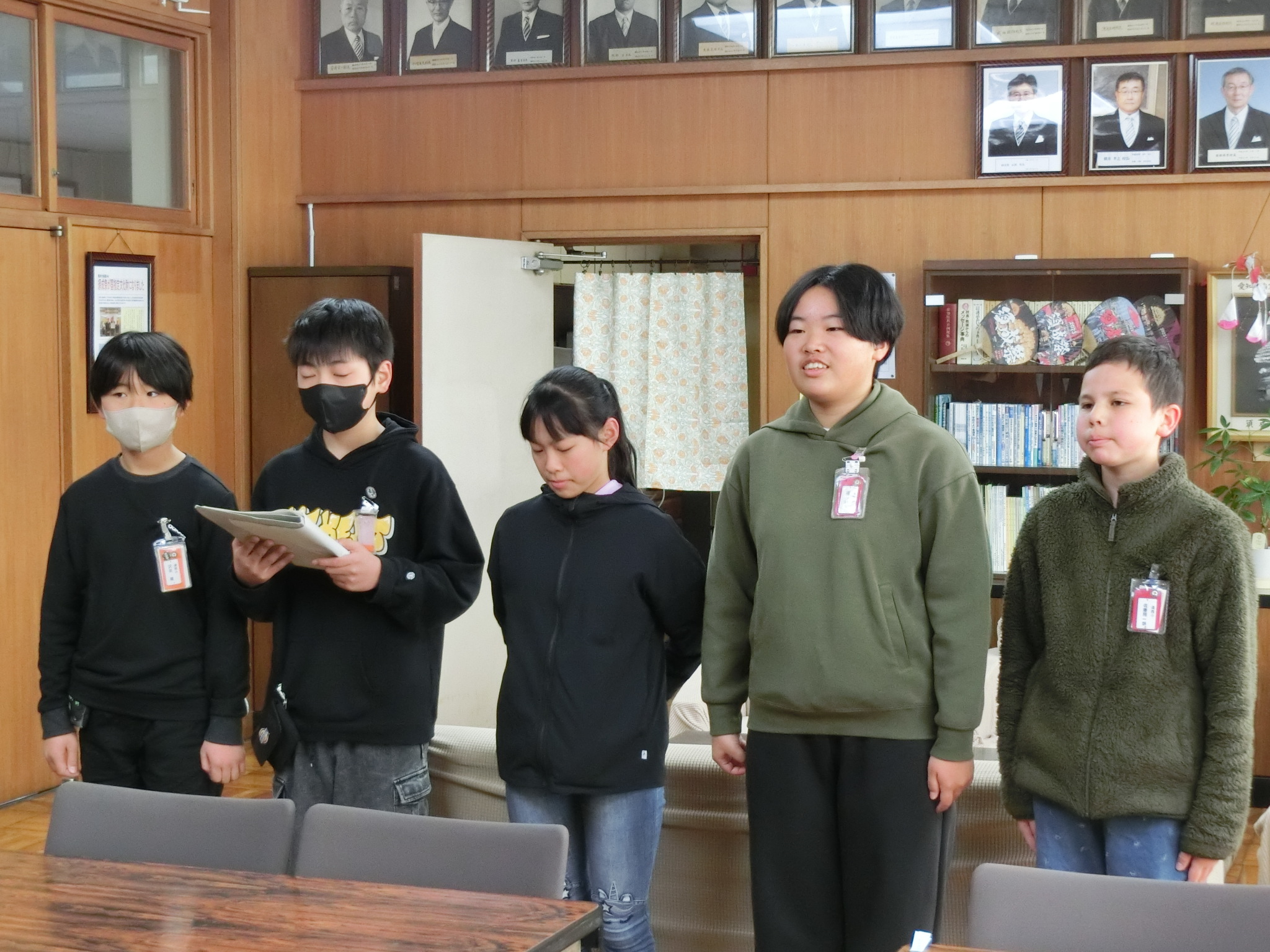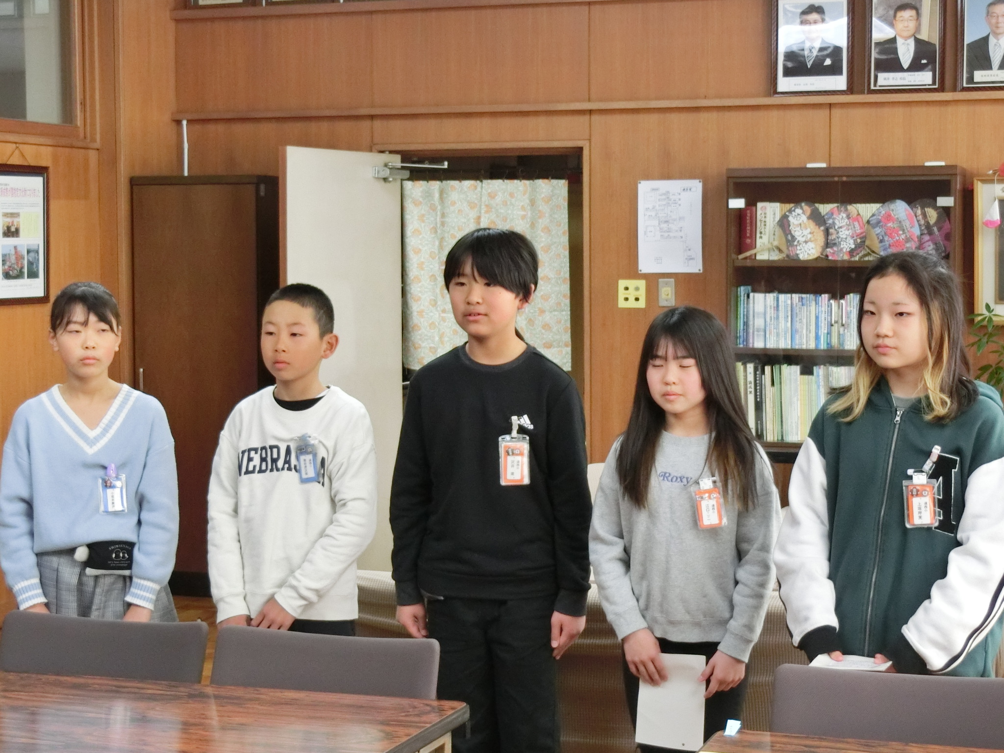 3月になりました。朝礼も今年度最後となりました。空手やそろばんなど、頑張った子たちの表彰を行いました。その後、児童会の引継式を行いました。令和7年度の後期児童会役員が、全校児童に向けて一言ずつ挨拶をし、その後、令和7年度前期児童会の役員へ引継ぎが行われました。